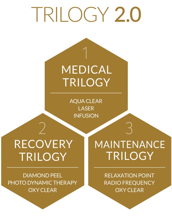 Introducing the iconic concept of SKIN+ Clinic, known as TRILOGY 2.0. This series features three main treatments: MEDICAL TRILOGY, RECOVERY TRILOGY, and MAINTENANCE TRIOLOGY, utilizing the latest technology in the field of medical aesthetics. The TRILOGY 2.0 concept has been proven to be both medically and aesthetically effective in nourishing the skin down to the dermis layer, resulting in moisturized and supple skin, also radiant and glowing complexion. SKIN+ Clinic employs cutting-edge technology to help you achieve healthier and more luminous skin instantly, starting from the first treatment.
